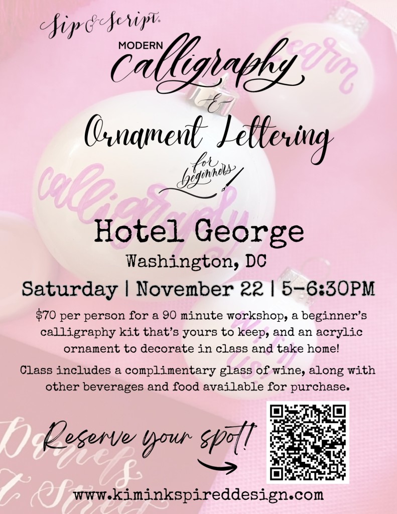In collaboration with local small business, Sip & Script, join us at Hotel George in Washington, DC, for a festive workshop of holiday fun and pretty lettering for beginners! Whether you’re a stationery nerd, DIY Bride-to-be, or just a crafty individual, in this workshop you’ll be learning an introduction to modern calligraphy with a pointed dip pen and ink. We will cover all the basics and get you ready to add those special lettered details to all your holiday tables, Christmas trees, hostess gifts, gift tags, holiday card mailings and more! Class includes 1.5 hours of instruction and demonstration, our beginner’s calligraphy kit (two nibs, black ink pot, 2 letter guides, tracing paper and straight pen holder), and all materials to write on. Everything is yours to keep at the end of the workshop as well as a complimentary glass of wine! Additionally, we will be lettering on a take-home acrylic ornament at the end of our class time!
