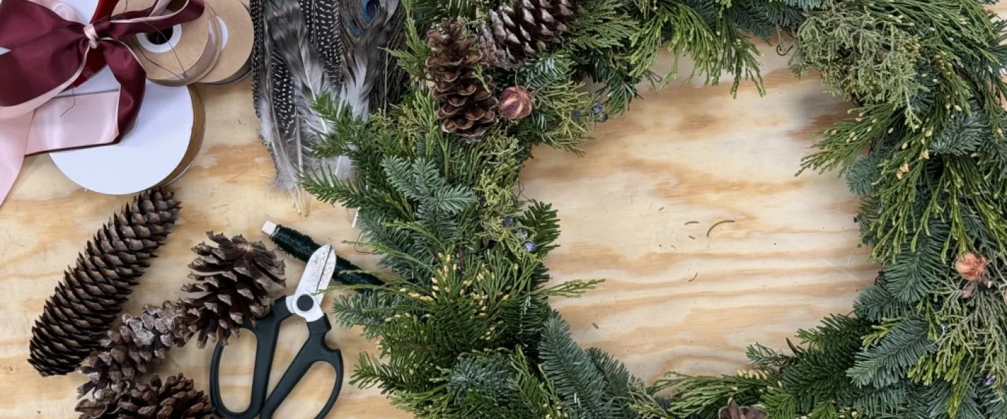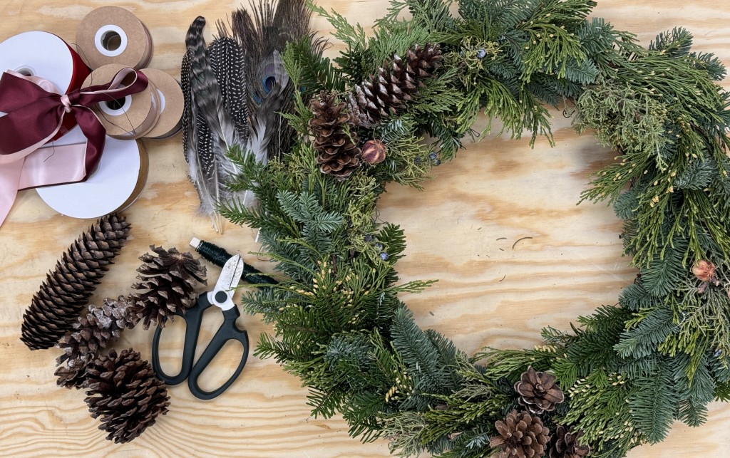Ready for the holidays and trimmings! Grab your friends and join us for mulled wine and wreaths. We provide everything you need-wreath base, greens, ribbons, and endless pinecones and other adornments. Full tutorial and hands on help.