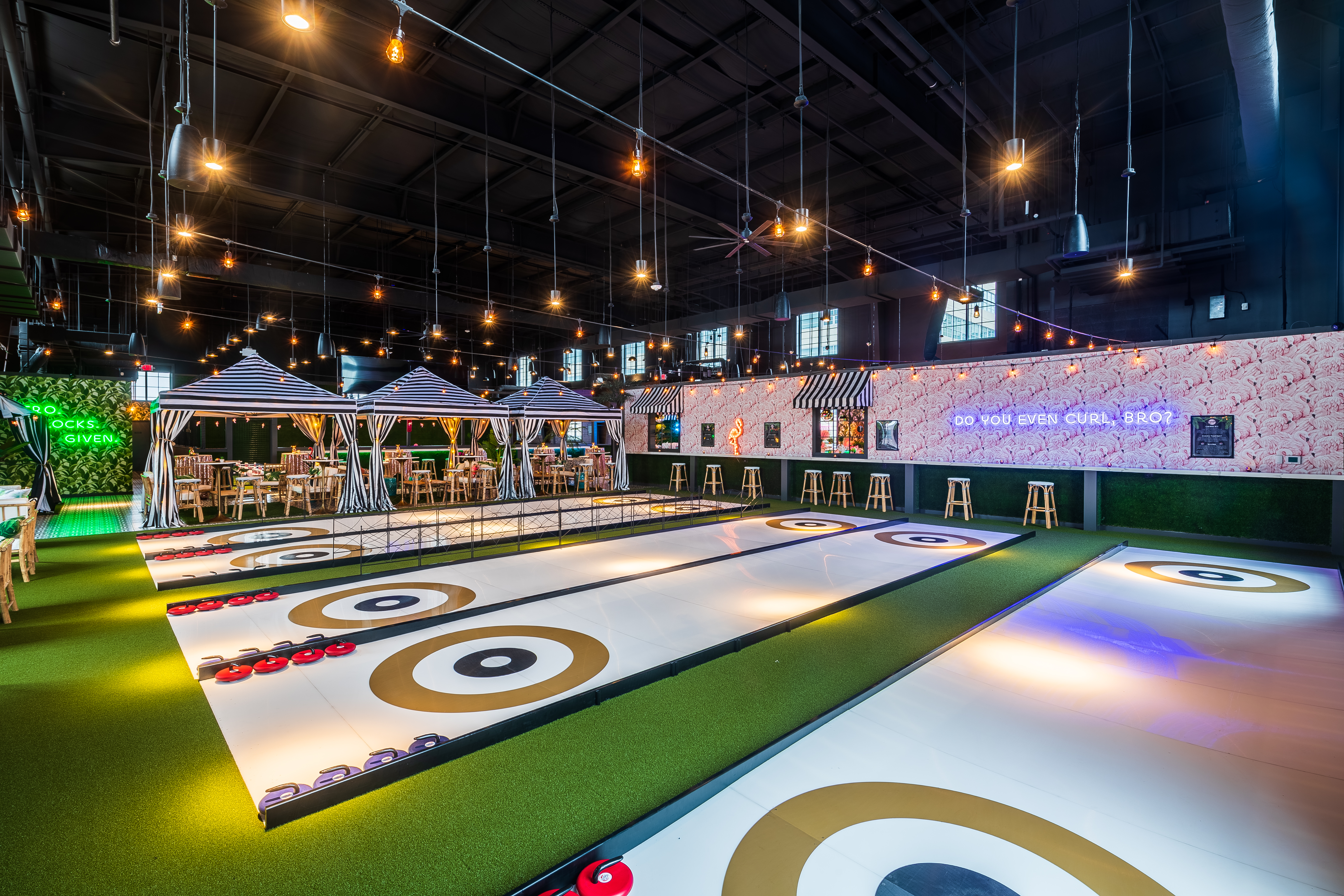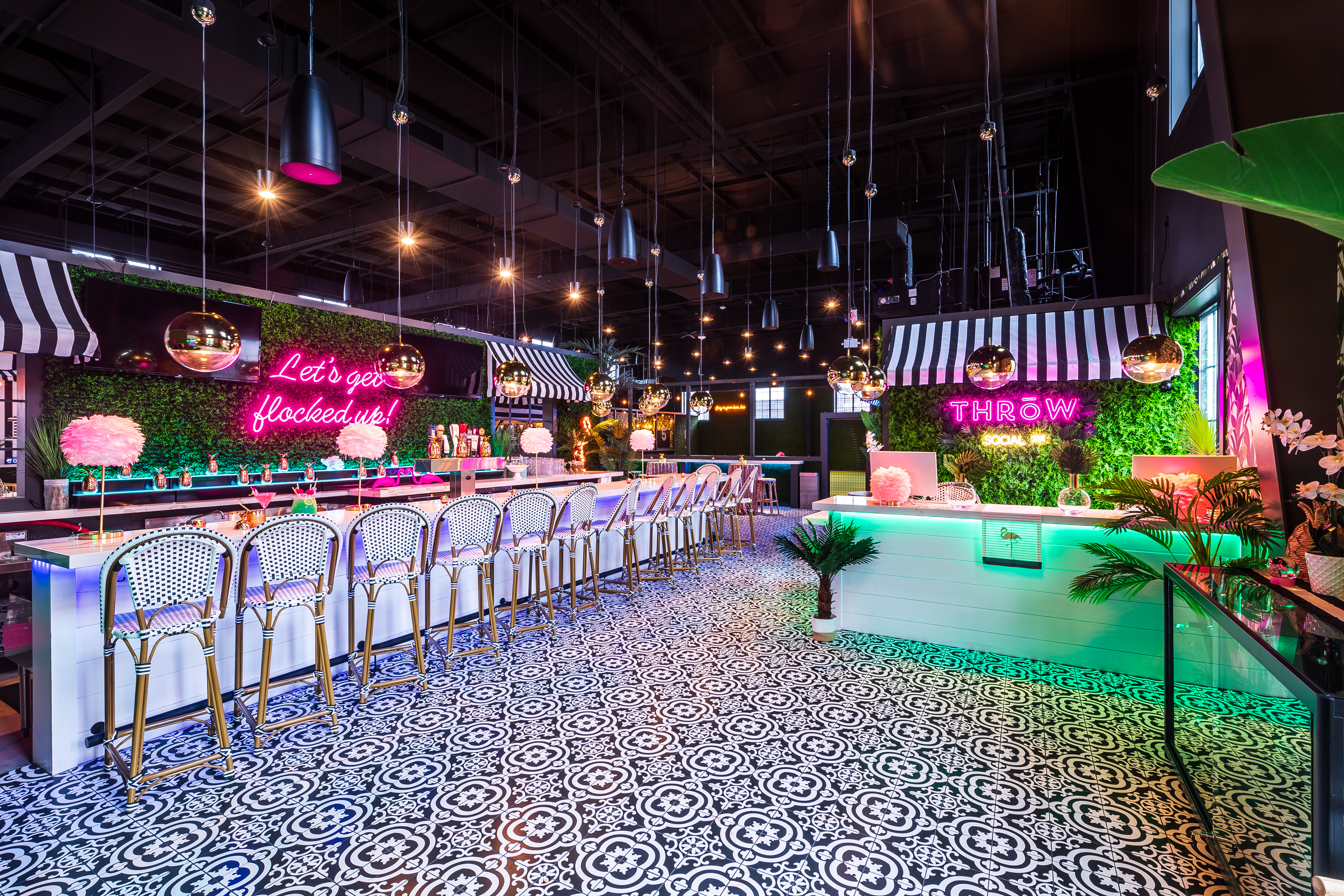 Flamingle upstairs at THRōW Social in an easy, breezy tropical atmosphere. Sip on specialty cocktails, indulge in mouthwatering food, and enjoy live DJs all day (or night!) long. Rent a VIP Cabana, play backyard-style games like corn hole & light-up ping-pong, then dance the night away!