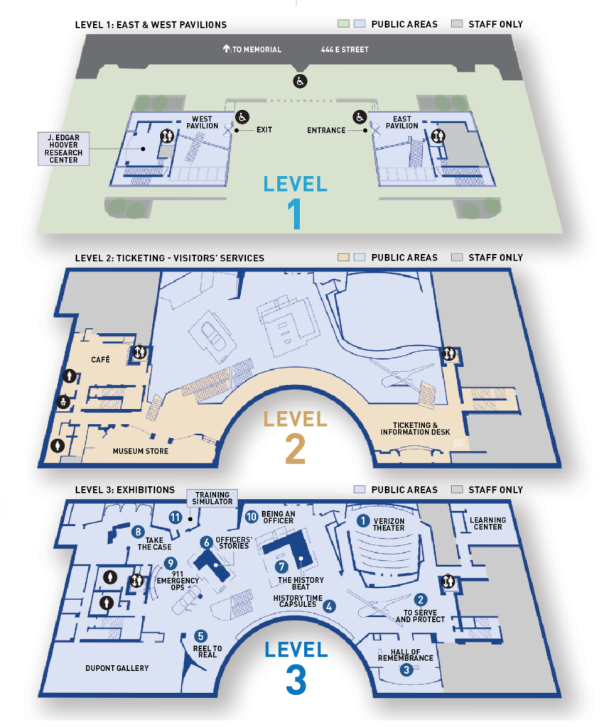 The 52,000 sq. ft. Museum has an open floor plan that is sleek and an architectural marvel. All underground, the Museum houses over 100 screens and a majority of those are interactive touch screens. Come for some law enforcement fun!